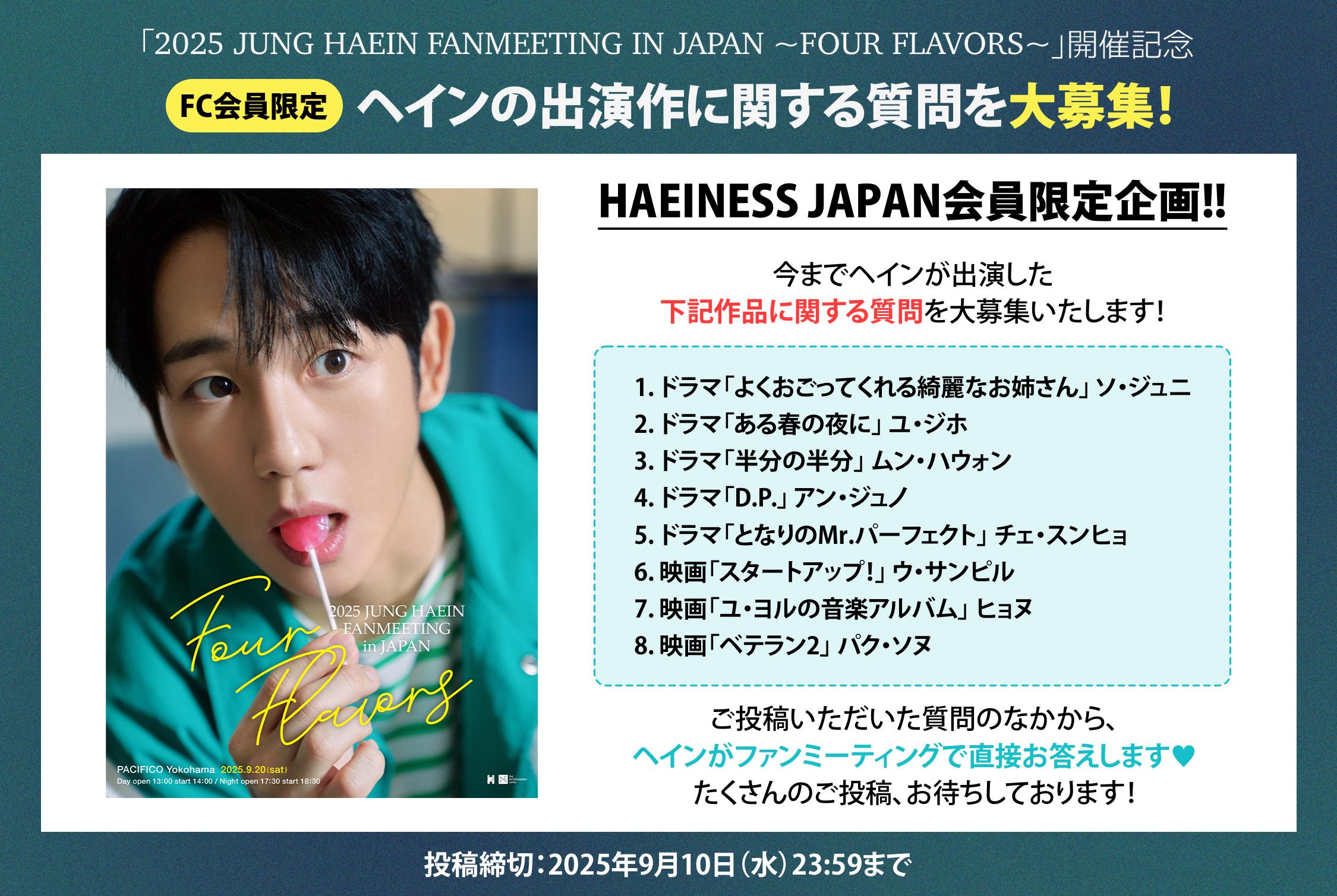 「2025 JUNG HAEIN FANMEETING IN JAPAN ~FOUR FLAVORS~」開催を記念して、今までヘインが出演した下記作品に関する質問を大募集いたします!