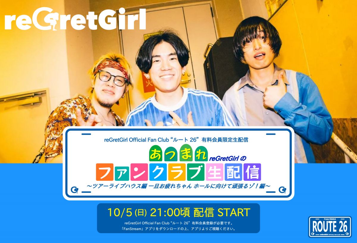 【FC生配信】オフィシャルファンクラブ "ルート26" 有料会員限定生配信 「あつまれ reGretGirlのファンクラブ生配信 〜ツアーライブハウス編一旦お疲れちゃん ホールに向けて頑張るゾ!編〜」配信決定!