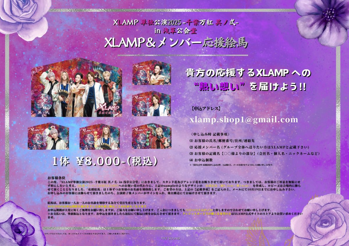 この度、『XLAMP単独公演2025 -千紫万紅 其ノ弍- in 浅草公会堂』におきまして、スタンド花及びアレンジ花をお断りさせて頂いております。つきましては、お客様のご厚意を無駄にせず形にしたいと考え、[応援メンバー]又は[XLAMP]へのお祝い花の代わりに、上記のsampleのようなデザインの「応援絵馬(縦9.2cm×横14cm)」を作成し、ロビー又は会場内に飾らせて頂くこととなりました。「応援絵馬」は1体ずつお客様のお名前を刻印致します。ご希望の方は、上記の【記載事項】をご記入の上、メールにて10月19日までにお申し込み下さい。