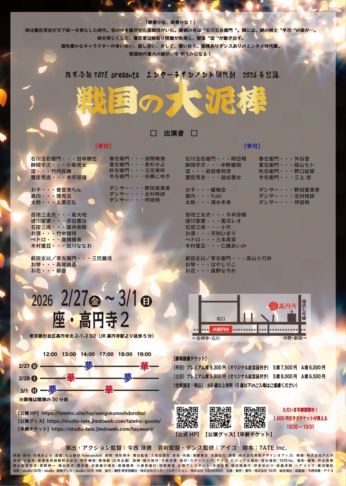舞台『2026年春公演「戦国の大泥棒」』に、田中順也(JUNYA)と源秀流(SHURU)の出演が決定いたしました!