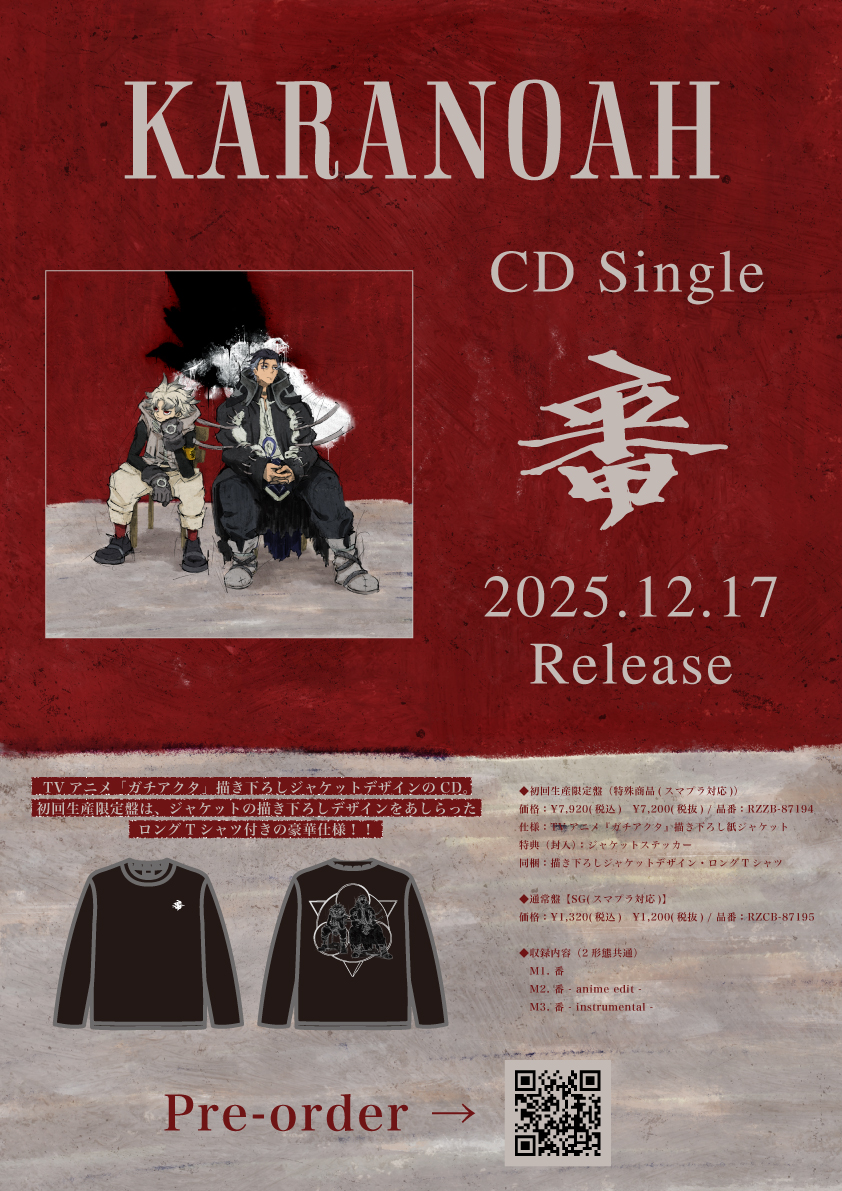 「番」は、カラノア初のアニメタイアップ楽曲。今回、雄大(Vo.Gt)が描き上げたのは、カオスな音像の中を一心不乱に駆け抜けるようなロックチューン。カラノアの得意とする先の読めない音楽展開が「ガチアクタ」の世界観を見事音楽作品へと昇華している。