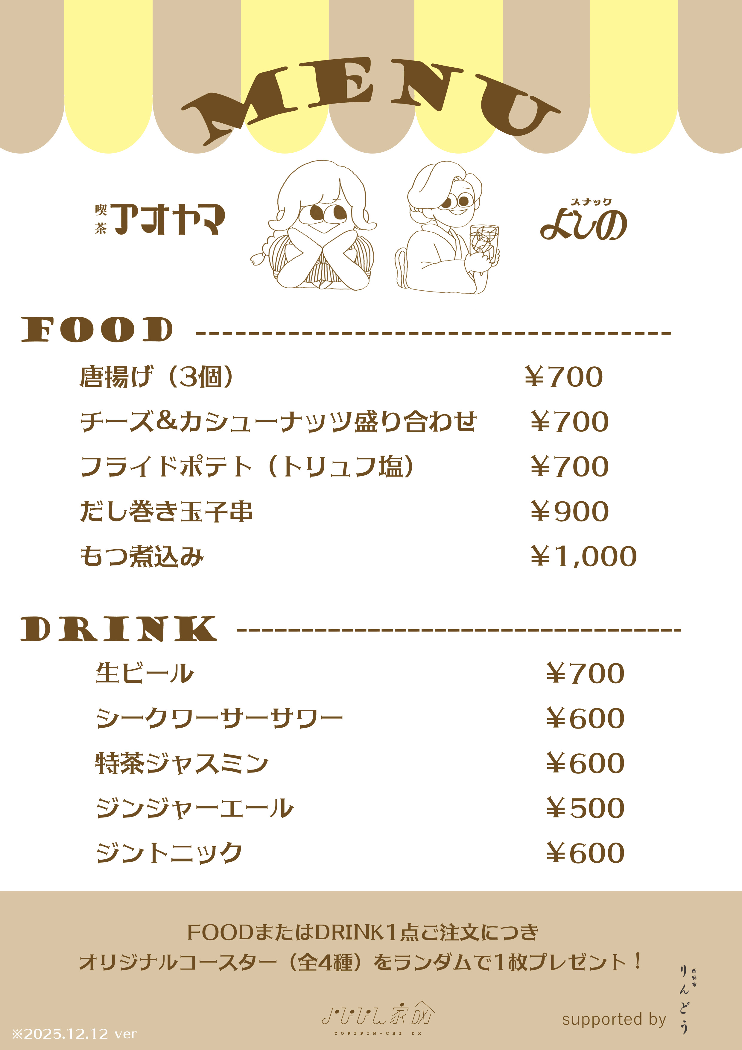 *12/12追記:オリジナルフードおよびドリンクにつきまして、昨今の物価高騰の影響により、価格を改定させていただきました。