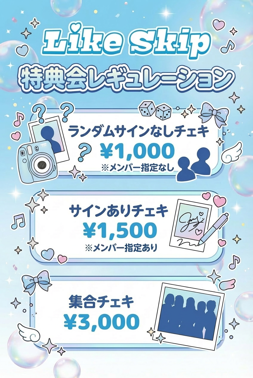 →NGポーズ:寝っ転がる、ジャンプする、下品なポーズ、不謹慎なポーズなど。常識の範囲内でチェキ撮影をお楽しみください。
