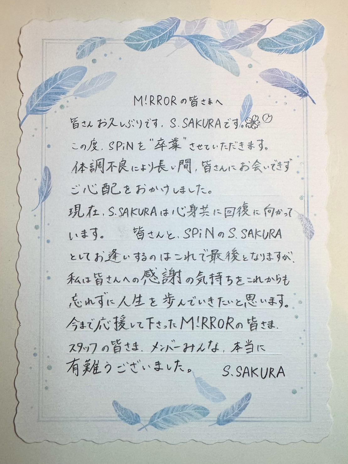 SPiNとして共に歩んだ日々に感謝するとともに、これから始まる S.SAKURAの新たなスタートを心から応援したい と考えております。