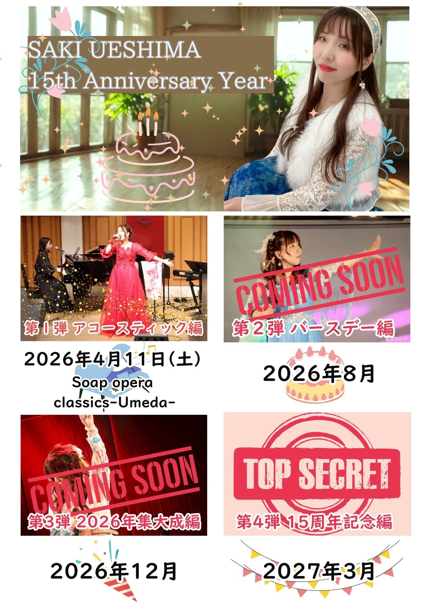 2026年4月から植島さき15周年イヤーに突入します🎉15周年イヤーを盛大に駆け抜けていきます🔥◇第1弾◇2026年4月11日(土)アコースティック編@Soap opera classis-Umeda-◇第2弾◇2026年8月バースデー編◇第3弾◇2026年12月2026年集大成編◇第4弾◇2027年3月15周年記念編