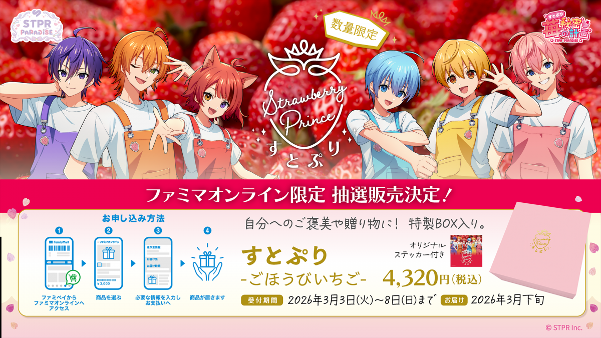 「スイーツパラダイス」との共同プロジェクト『STPR PARADISE』の「苺の秘密計画」から誕生したオリジナルブランド苺『すとぷり』に嬉しい新展開!東京・大阪でのコラボカフェの開催とあわせて、より多くの方にこの特別な苺をお楽しみいただくため、ファミリーマートの公式オンラインショッピング「ファミマオンライン」にて、数量限定で「ごほうびいちご」の抽選販売を実施中です。