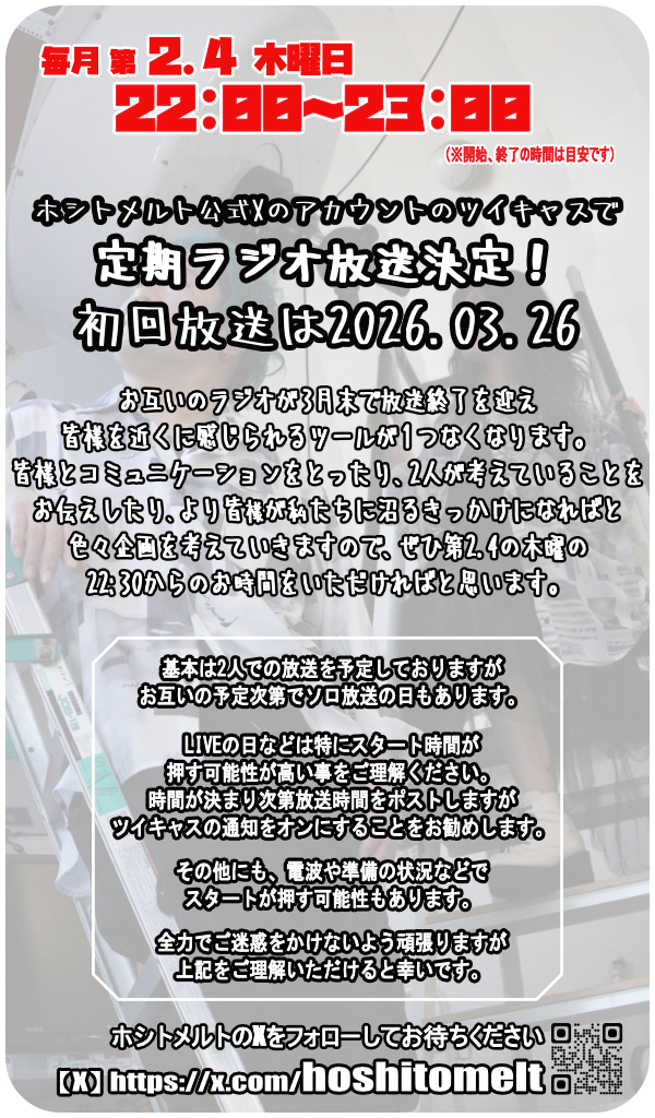 ホシトメルト公式【X】のアカウント(@hoshitomelt)で毎月第2.4木曜22:30~23:00放送決定。