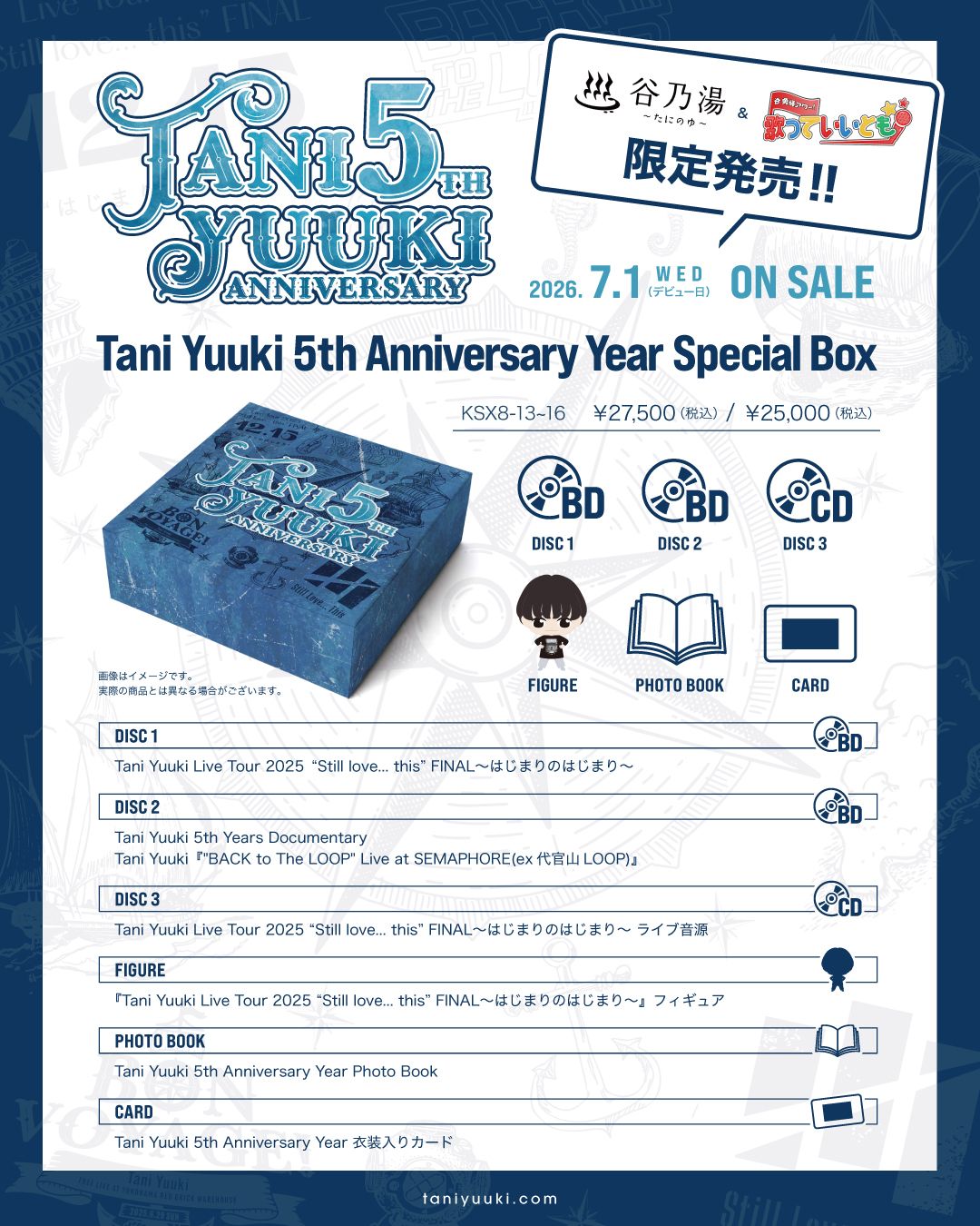 FC限定のスペシャルボックスには、12月15日に日本武道館で開催された『Tani Yuuki Live Tour 2025 “Still love... this” FINAL〜はじまりのはじまり〜』の模様を収めたライブBlu-rayに加え、12月22日に開催された『"BACK to The LOOP" Live at SEMAPHORE(ex代官山LOOP)』のライブ映像、さらに1年に及びTani Yuukiのライブ活動に密着した『Tani Yuuki 5th Years Documentary』を収録。