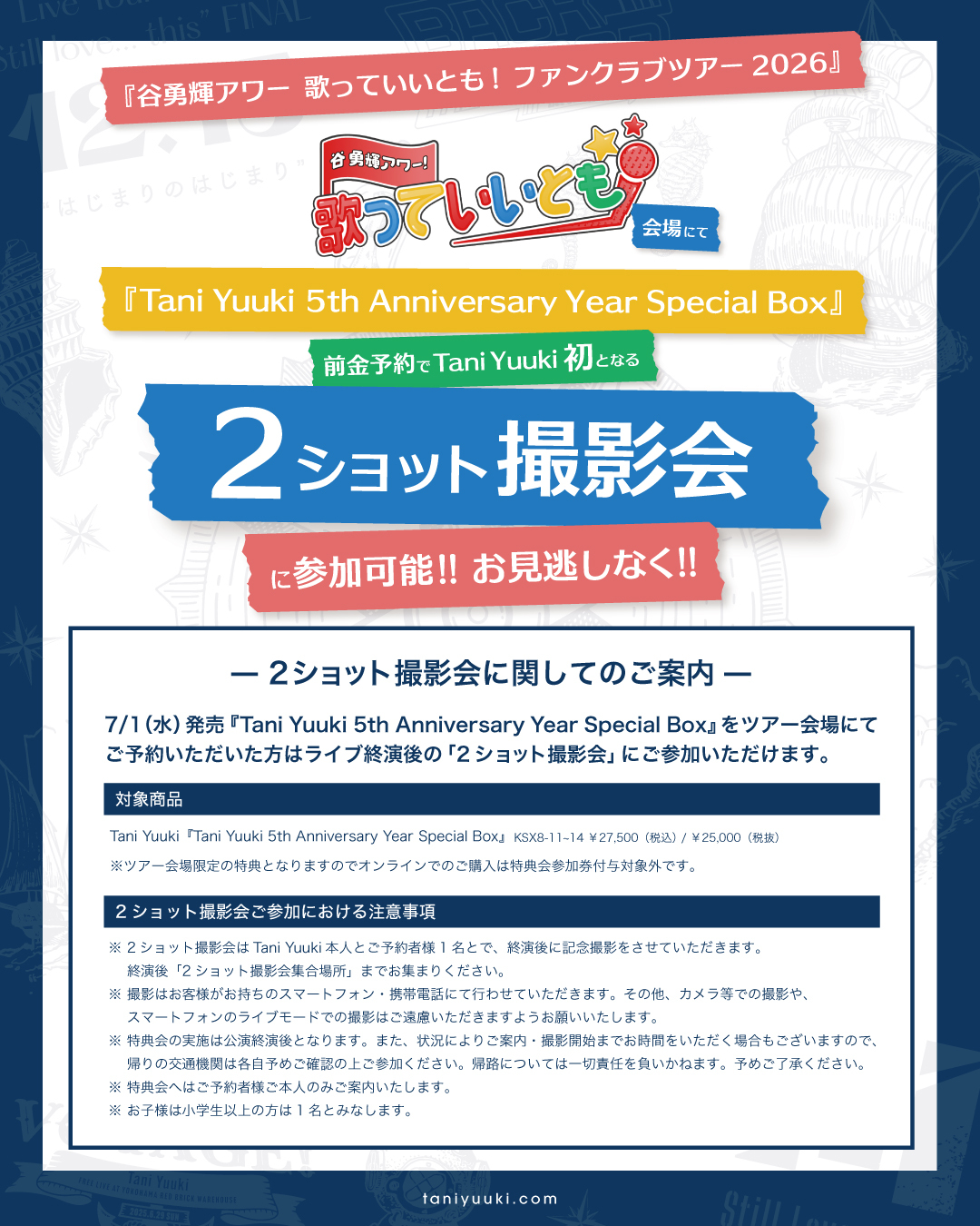 「Tani Yuuki 5th Anniversary Year Special Box」の発売を記念し、『谷勇輝アワー 歌っていいとも! ファンクラブツアー2026』ツアー会場で全額前金予約をしていただいた方を対象に、終演後の2ショット撮影会を開催いたします!