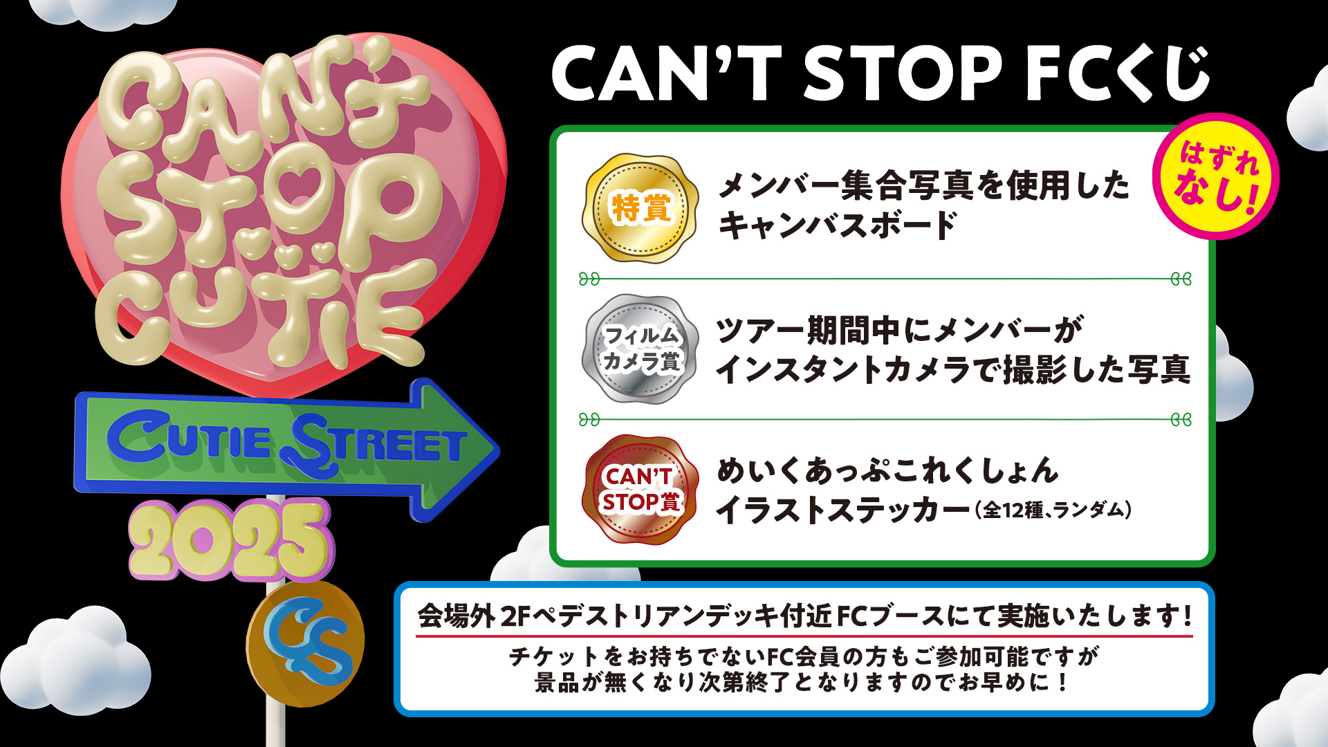 FANCLUB TOPIC【CUTIE STREET OFFICIAL FANCLUB】10/12(日)13(月・祝)『CUTIE STREET 1st ANNIVERSARY JAPAN TOUR 2025「CAN’T STOP CUTIE」』FC連動企画「CAN’T STOP FCくじ」のお知らせ
